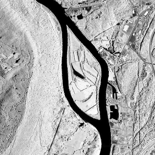 Water exhibits a strong absorption for energy in the NIR wavelengths, making it easily visible in imagery. In the figure below, water appears as black pixels. This strong relationship with water also applies to water-laden substances such as soil, allowing for the presence of water to be detected even while in a mixture.