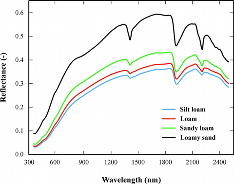 Differences in reflectance in portions of the NIR spectrum have been associated with various geophysical soil attributes, including organic carbon content, silt, sand and clay fractions, and soil moisture. Soil fraction relationship with NIR reflectance can be seen in the figure below.